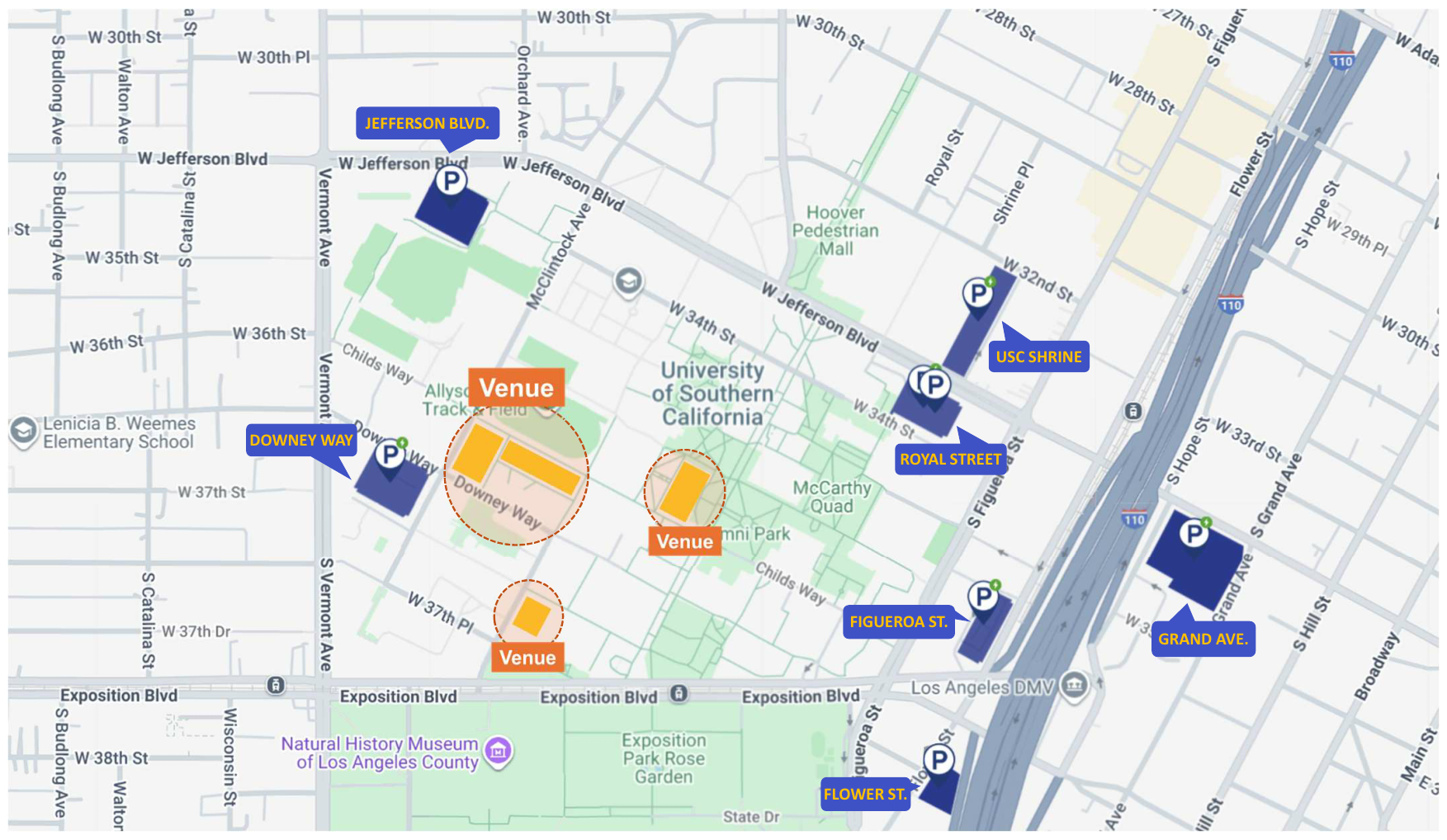 Metro stations (Expo Park/USC Station and Jefferson/USC Station) are located within a short walking distance of the main conference venues.
