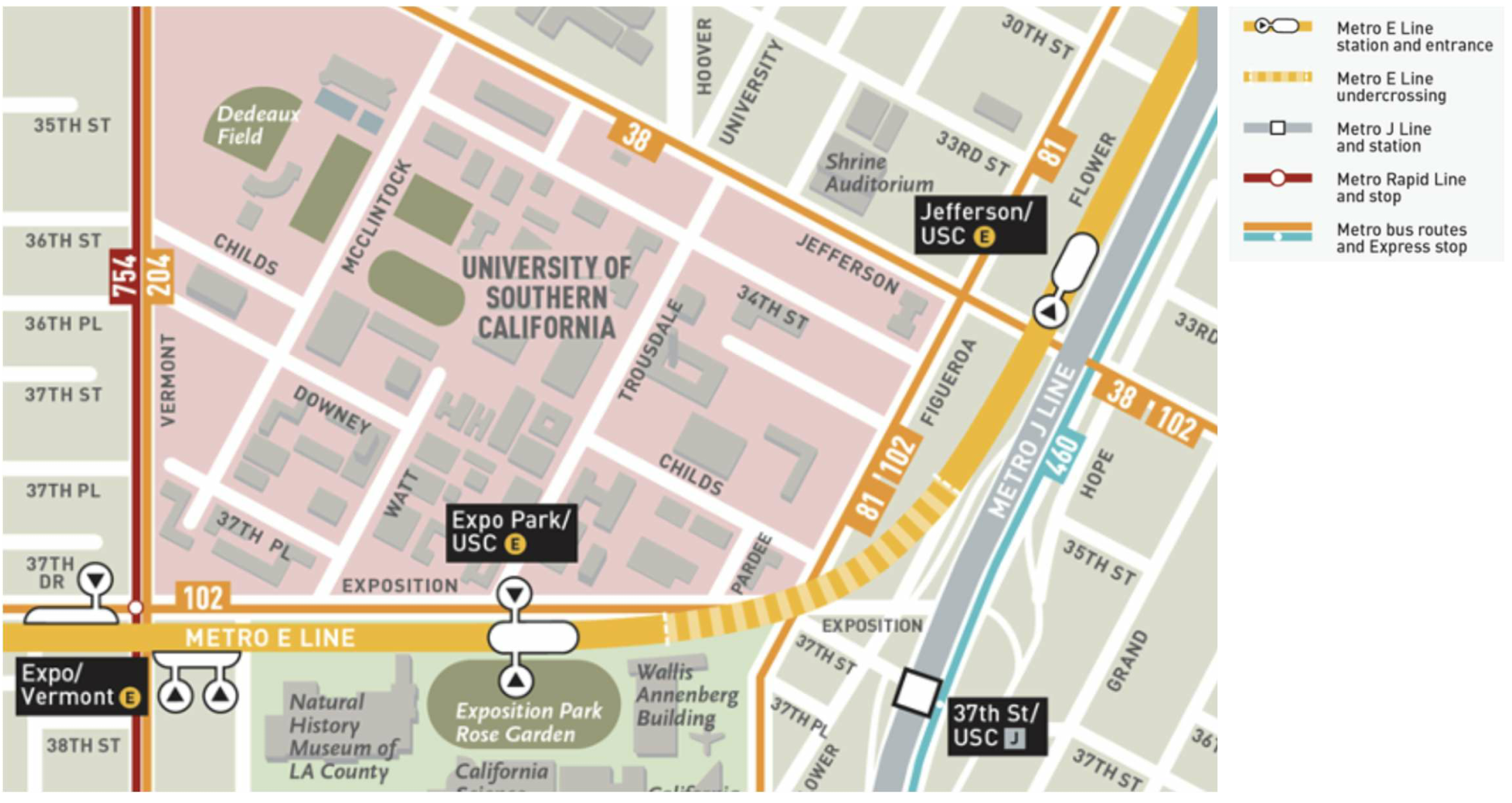 The Metro E Line (Expo Line) provides direct service to the USC from several key areas of Los Angeles, including: